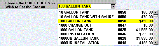 display a drop-down list of Price Codes. Left-click the one you want to enter a cost for, like this: