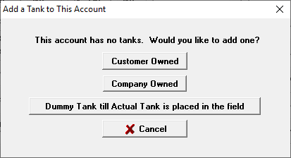 Company owned tanks are ALWAYS added to a customer account from the Yard File (Account 0).